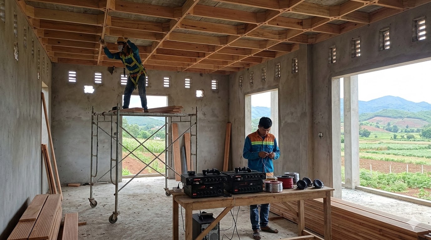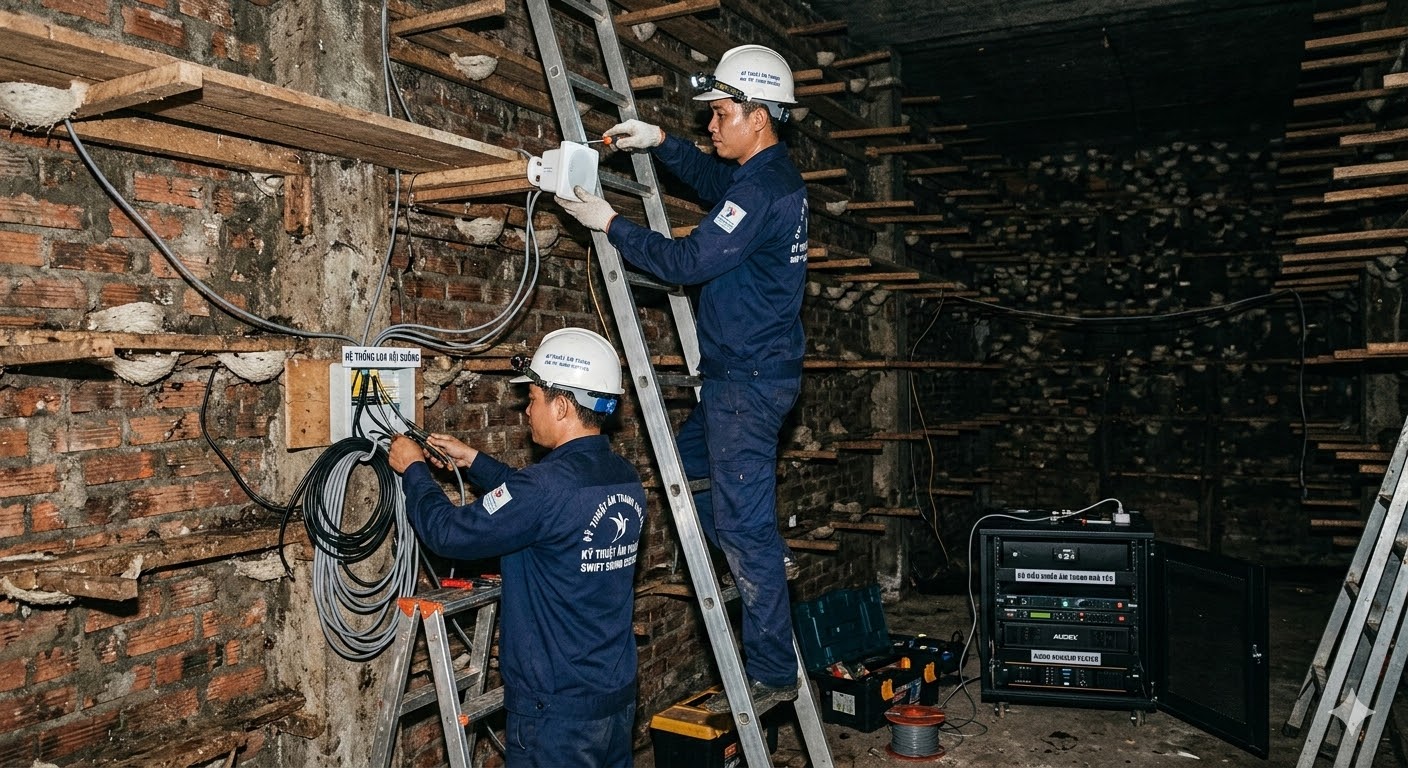 Hình 3: Đội ngũ kỹ thuật lắp đặt hệ thống âm thanh chuyên dụng