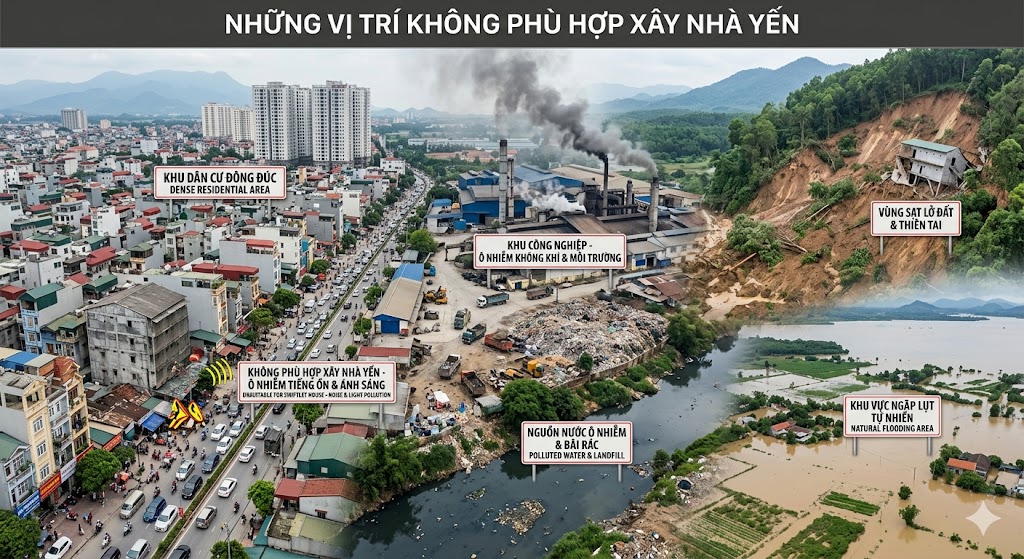 Hình 3: Những vị trí không phù hợp xây nhà yến