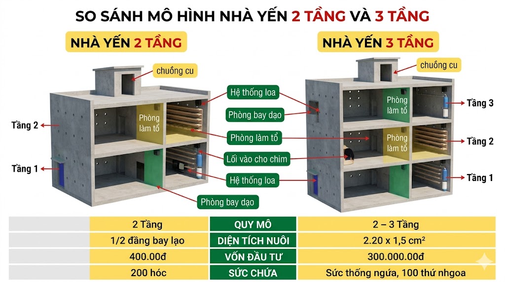 Hình 2: So sánh mô hình nhà yến 2 tầng và 3 tầng
