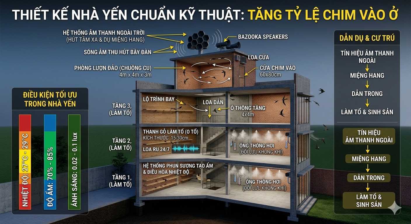Một bản thiết kế phù hợp không chỉ giúp chim yến dễ dàng thích nghi mà còn giúp tăng tỷ lệ chim về làm tổ và phát triển đàn ổn định.